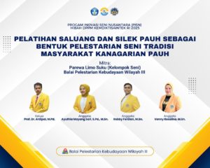 Tim Program Inovasi Seni Nusantara (PISN) Universitas Negeri Padang (UNP) melanjutkan rangkaian kegiatan kedua bertema “Pelatihan Saluang dan Silek Pauh sebagai Bentuk Pelestarian Seni Tradisi Masyarakat Kanagarian Pauh.” Kegiatan yang didanai Hibah DPPM Kemdiktisaintek RI 2025 ini bekerja sama dengan Balai Pelestarian Kebudayaan Wilayah III dan kelompok seni Parewa Limo Suku sebagai mitra utama.
